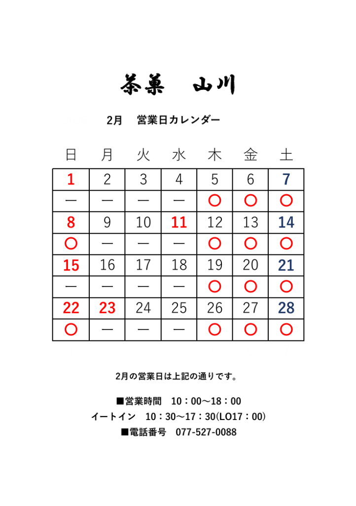 2月の営業日カレンダー 投稿日 2026年1月29日 著者 茶菓 山川 カテゴリー お知らせ カテゴリー 営業日カレンダー カテゴリー 季節限定メニュー 秋冬シーズンに大人気の「柿喰へば」…干し柿と栗あん 1/29(木)~1/31(土)までの3日間 節分生菓子を販売しております。 営業日 季節限定 節分 茶菓山川 菱屋町商店街 この記事を書いた人 茶菓 山川 記事一覧 ウェブサイト